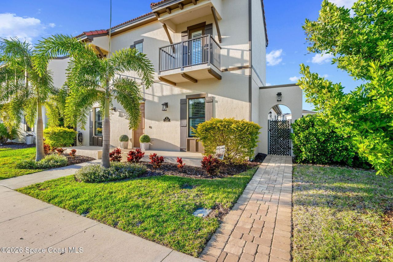 Welcome to maintenance free living in Viera. Impeccably maintained and thoughtfully upgraded, this stunning Almeria model offers 4 bedrooms, 3 full bathrooms, and approximately 2,601 square feet of well-designed living space on a premium corner lot. One of the homes most distinctive features is its private, fenced courtyard, complete with puppy picket fencing, mature clusia privacy hedges, and a generous dog run, creating an ideal setting for pet lovers while providing exceptional privacy for relaxing or entertaining. nside, pride of ownership is immediately evident. The entire first floor showcases upgraded engineered hardwood flooring, enhanced by 8-foot doors, 10-foot ceilings, crown molding, plantation shutters, recessed lighting, and quality ceiling fans throughout. The spacious family room flows seamlessly to the screened lanai, which is already equipped with a natural gas hookup for a future summer kitchen or grill, plus plumbing in place for a sink, making outdoor entertaining effortless. The gourmet kitchen is both elegant and functional, featuring white shaker cabinetry with soft-close drawers, under-cabinet lighting, quartz countertops, a five-burner gas range with vented hood, herringbone backsplash, and a large walk-in pantry. A true formal dining room easily accommodates gatherings of family and friends. The first-floor primary suite is a private retreat, offering dual quartz vanities, a soaking garden tub, a large walk-in shower tiled to the ceiling with mosaic flooring, and a spacious walk-in closet. A second bedroom and full bathroom on the main level, featuring quartz countertops and an upgraded glass shower door, provide excellent flexibility for guests or multi-generational living. Upstairs, youll find two additional bedrooms, each with private balconies, along with a full bathroom featuring a dual quartz vanity and upgraded glass shower door. A loft area offers the perfect flex space for a home office. Additional highlights include a 2-car garage plus an upgraded golf cart garage with epoxy flooring, painted walls, built-in cabinetry, and a workbench that conveys, along with a Google Nest smart-home system, front door keypad entry, and a 10-camera Lorex security system. This move-in-ready home delivers privacy, quality, and exceptional functionality in every detail. Amazing location! Minutes away from the Addison Village Clubhouse, Publix, Costco. Less than a 20 minute drive to the beaches. Close proximity to A- Rated schools, Viera Hospital & The Avenue Shopping center