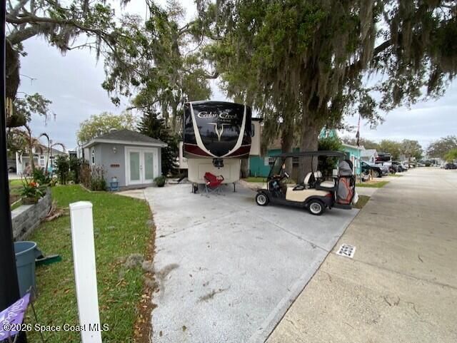 This is a shady lot located in an active 55+ community ready to park your RV or you can custom build a home. There is an accessory building of 140 sq ft with a full bathroom, washer/dryer and room for storage. Has Split AC unit in the building. Plenty of parking for any type of RV and motorcycle friendly community. Enjoy seasonally or year round resort lifestyle. Active 55+ living with heated pool, clubhouse, pickleball, tennis, shuffleboard and activities. There is an executive golf course on property and watch rocket launches from your front yard! Close to airports, theme parks, beaches, shopping and restaurants.