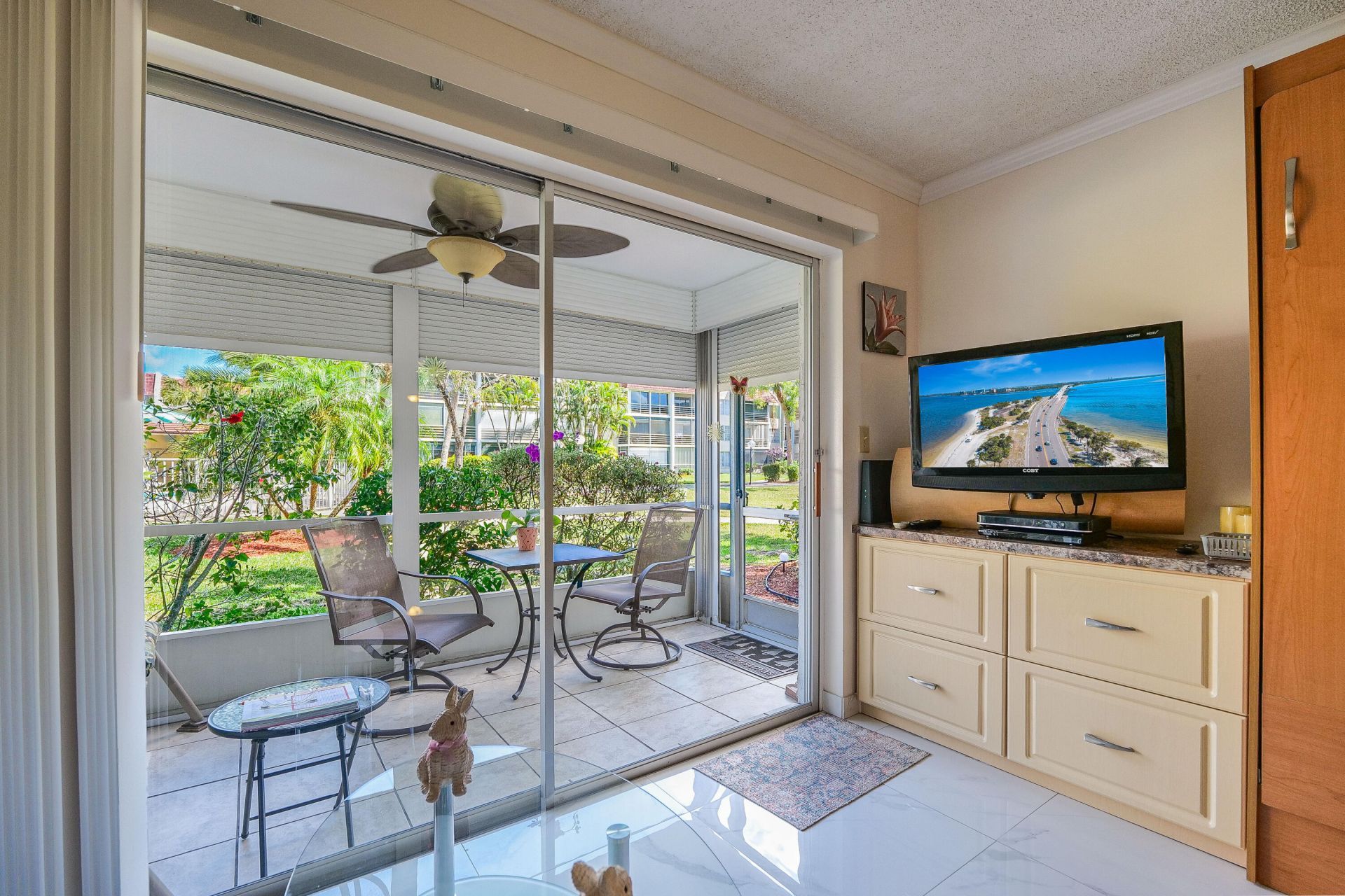 Very nice garden apartment! Just step out and walk to the pool! Furnished! A 55+ complex. Pool view. Large 24 Porcelain tiles thruout! Kitchen boasts new cabinets & pass thru to dining room! Roll shades on terrace. Living room has a Murphy bed to use for guests! Gated & fenced! 40 year inspection & work Done! Pools, BBQ area, a gate, shuffleboard, a clubhouse with a card room, library, kitchen, gym, & more. Common Laundry. The maintenance fees include landscape, cable TV, internet, trash, water/sewer, common area insurance, roof, and outdoor pest control. One owner must be at least 55 and any other occupants must be +50, the other can be at least 50. 6 mos maint fee held in escrow for 18 months. 20% down per the association. , no pets. A Great Community to live!
