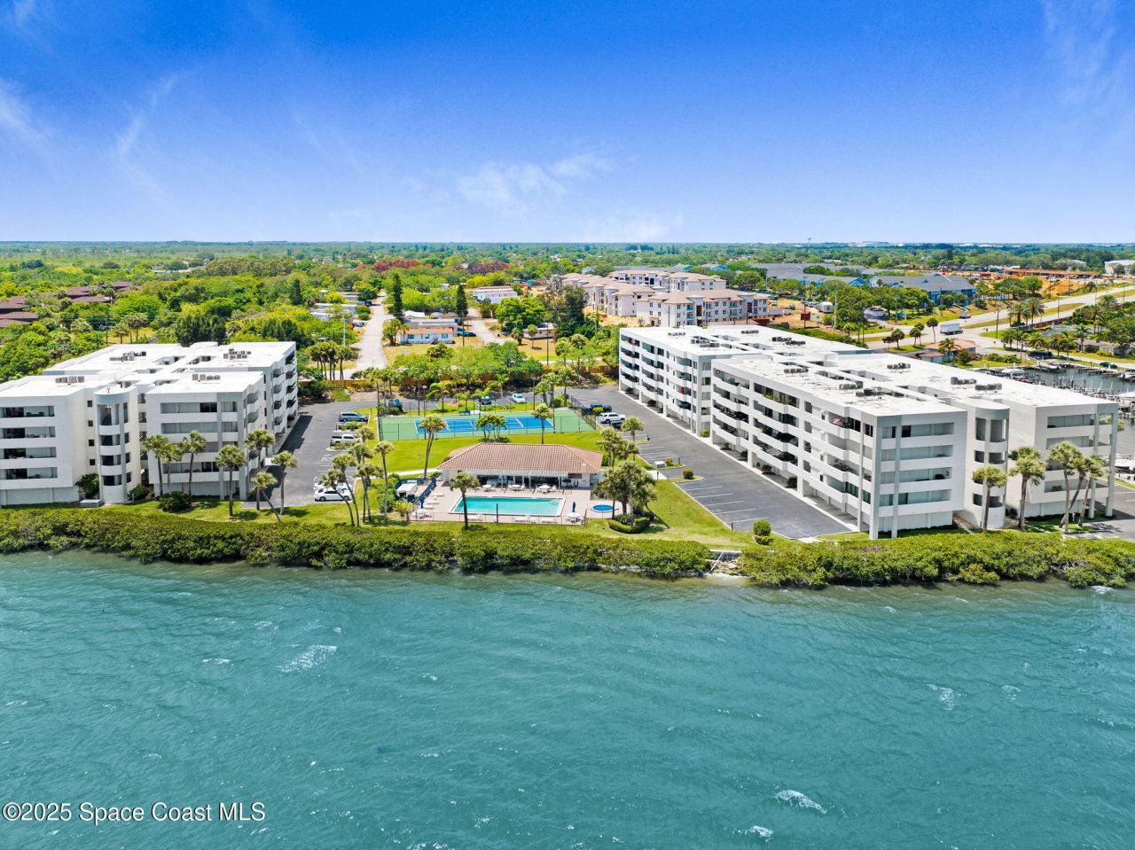 DEEDED Boat Slip w/unit in this fabulous waterfront community with Private Marina. The amenities are amazing! Salt water Heated Pool and Hot Tub. Pool is chilled in the summer. Beautiful clubhouse with full kitchen, restrooms, showers and sauna. Fitness room overlooking private marina. Tennis and pickleball courts. Fishing pier & park benches to watch incredible sunrises and wildlife. Enter Atrium with lush foliage to access elevator or stairs. Unit is turnkey w/beautiful furnishings, open floor plan & huge private balcony Oversized sliders from living/dining area & two bedrooms w/direct access to balcony. Split floor plan! MBR w/private bathroom suite & custom closets. Guest bath w/tub & shower. Beautiful kitchen with custom cabinetry and granite counters. Lots of closets & huge private storage area in garage. Additional assigned parking & plenty of guest parking available. Boat slip can accommodate 32 ft vessel. Electric & water at docks.