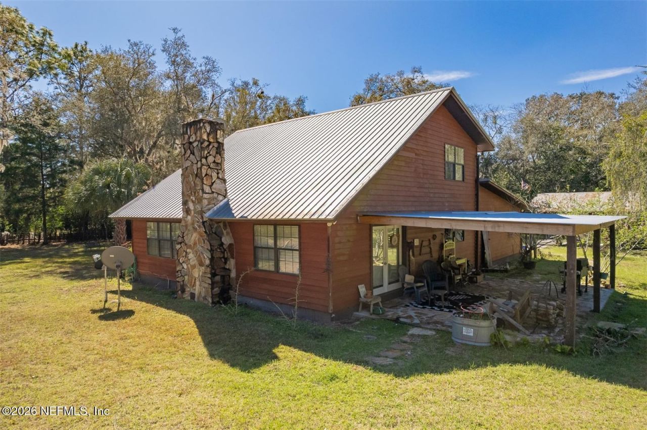 Charming 2 BR/2BA home with loft nestled in a private, serene setting surrounded by Rice Creek Conservation Area Sate land on three sides. Thoughtfully designed, the home offers a flexible layout with a bedroom and full bath on each level, ideal for guests or multigenerational living. The upstairs also features a spacious loft overlooking the open-concept great room and dining area, anchored by a stunning stone fireplace. Enjoy peaceful views of nature from the beautiful stone back porch, now covered with a brand-new metal roof - perfect for relaxing or entertaining. The home is set back from the road and accessible by State easement, ensuring both privacy and convenience. Additional features include a detached double carport with workshop, which has entry from the carport and a roll top entry door from the side, ideal for yard equipment or hobbies. Beautiful Oak trees not only garnish the landscape but also provide welcoming shade on those hot Florida days. In addition, there are several established fruit trees, including figs and oranges. This 2.02-acre parcel is legally described as two 1.01-acre parcels. The back 1.01-acre parcel has a view of Rainbow Lake from the far NW corner. Separate ingress/egress easement is provided by the State for this parcel - great opportunity for family compound living! Although location is rural, it's just a short distance to shopping, medical, restaurants etc., and of course, the magnificent St. Johns River. No HOA and plenty of room for your outdoor fun accessories.