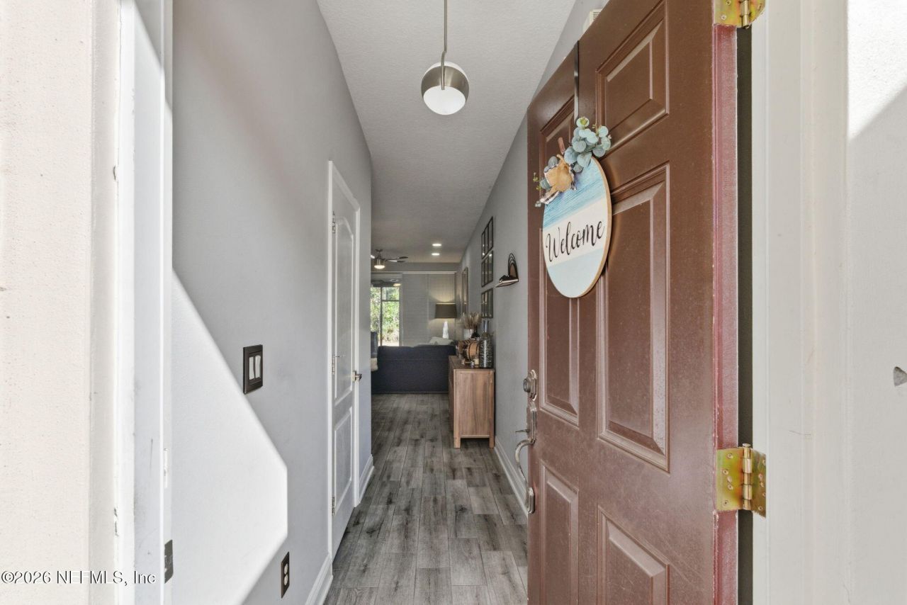 Well maintained 3-bedroom, 2.5-bath townhome offering 1,368 sq ft of living space in the Bartram Springs community. The open floor plan features a spacious living and dining area with LVP flooring throughout. The kitchen includes granite countertops, 42'' upper cabinets, and stainless steel appliances, and opens directly to the main living space--perfect for entertaining. Upstairs you'll find three spacious bedrooms with plantation shutters and tile flooring in the bathrooms. Enjoy relaxing outdoors on the screened-in rear patio with storage closet and an extended paver deck overlooking a peaceful pond and preserve. Garage features a privacy screen and plenty of room for storage. Conveniently located within walking distance to the community school and amenities, including a pool and playground. Great opportunity to enjoy low-maintenance living.