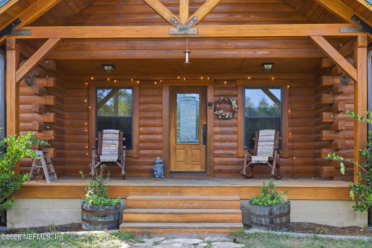 Welcome to this beautiful custom Red Cypress log home, perfectly set on 10 serene acres and offering the charm of cozy country living. Enjoy peaceful mornings on the front porch and relaxing evenings on the back porch surrounded by nature.Inside, the open living and kitchen area features an eat-in island, creating a warm and inviting space for gathering. The spacious owner's suite includes a large walk-in shower and walk-in closet. The loft offers flexibility as an office, playroom, or cozy movie retreat.Step outside and enjoy the natural setting, with plenty of space for gardening, animals, or simply taking in the quiet beauty of the land. The property backs up to the South Prong of the St. Marys River, adding to the peaceful and private surroundings.Additional features include a large laundry room, roof approximately 2 years old, whole-house generator, and added sub panels. Move-in ready and the perfect place to enjoy a relaxed country lifestyle.